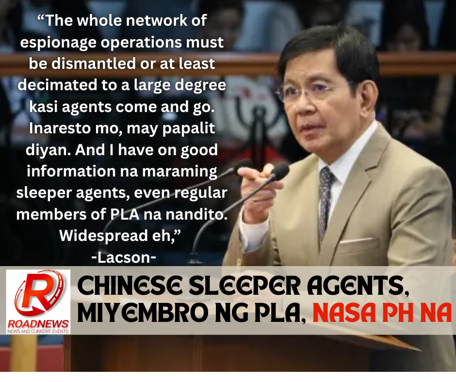 May mga Chinese “sleeper agents” at maging operatiba ng People’s Liberation Army (PLA) ng China na nakapasok na sa Pilipinas upang magsagawa ng pag-espiya o espionage, ayon kay Sen. Panfilo “Ping” M. Lacson ngayong Miyerkules.