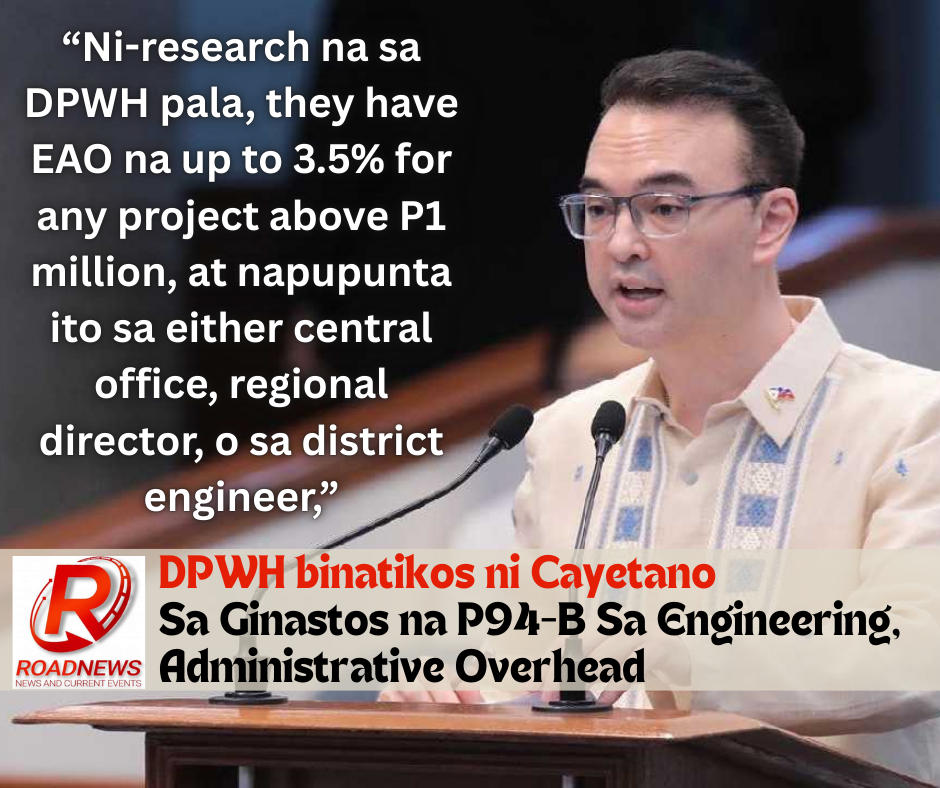 Matinding binatikos ni Senador Alan Peter Cayetano nitong Miyerkules ang Department of Public Works and Highways (DPWH) matapos umabot sa P94 bilyon ang nagastos para sa Engineering and Administrative Overhead (EAO) mula 2022 hanggang 2025, kahit hindi naman natitiyak ang kalidad ng mga proyekto na nauuwi lang sa sayang na pondo.