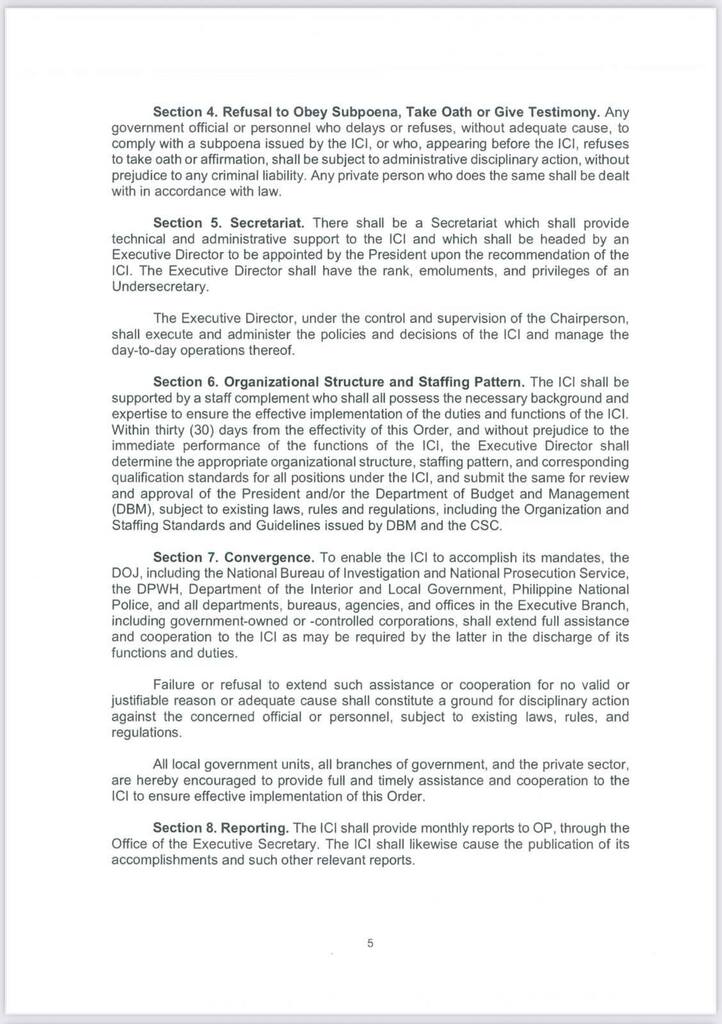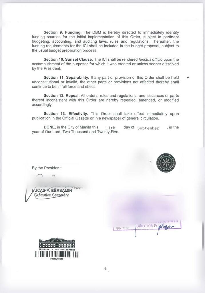Ang komisyon ay bubuwagin sa sandaling matapos ang kanilang tungkulin, o maaaring mas maaga kung ito ay pagtibayin ng Pangulo. Inatasan naman ang Department of Budget and Management na maglaan ng pondo para sa operasyon ng ICI.