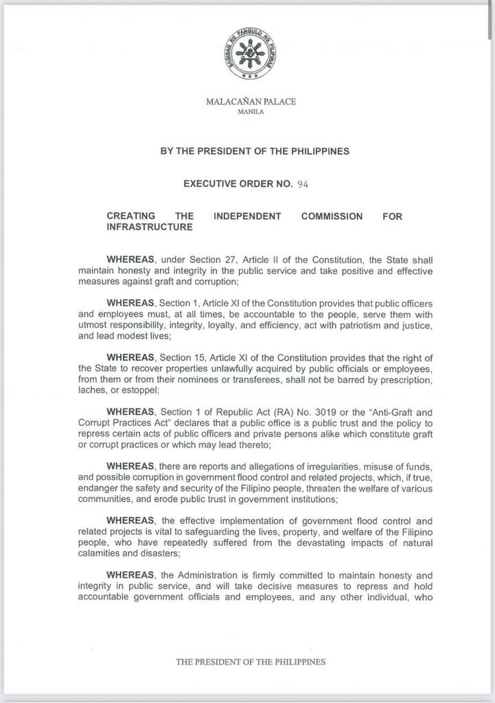 MAYNILA – Nilagdaan na ni Pangulong Ferdinand Marcos Jr. ngayong Setyembre 11, ang Executive Order No. 94 2025, isang Independent Commission ang itinatag upang imbestigahan ang mga alegasyon ng katiwalian at irregularidad sa mga proyektong imprastruktura ng pamahalaan, partikular na sa mga proyektong flood control..