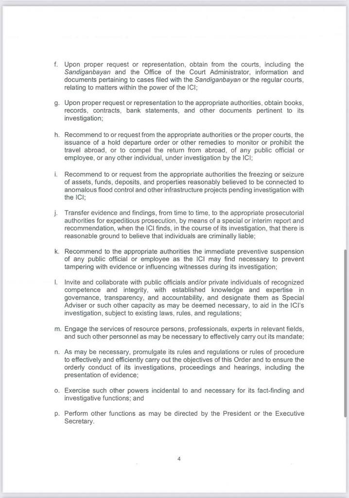 Ang komisyon ay may mandato na magsagawa ng mga hearing, mangalap ng ebidensya, at mag-evaluate ng mga ulat na may kinalaman sa mga proyektong imprastruktura. Kabilang sa mga ito ang mga proyektong ipinatupad ng Department of Public Works and Highways (DPWH) at ng iba pang mga ahensya ng pamahalaan.