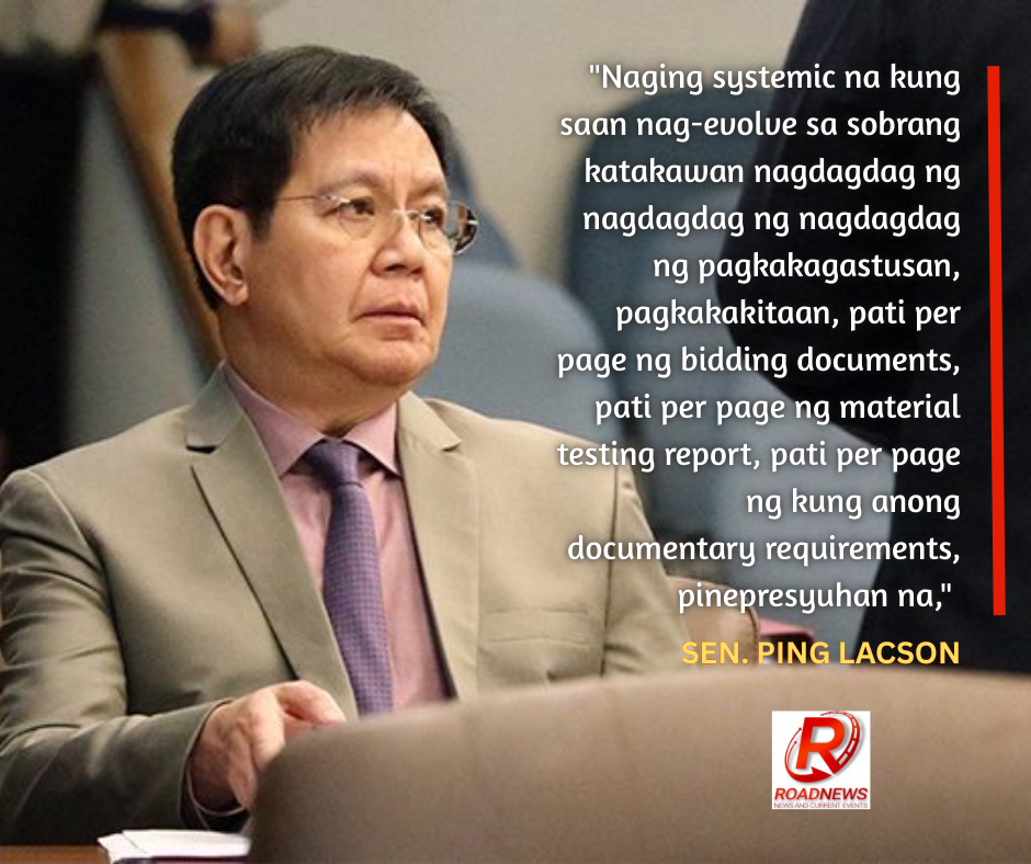 “Naging systemic na kung saan nag-evolve sa sobrang katakawan nagdagdag ng nagdagdag ng nagdagdag ng pagkakagastusan, pagkakakitaan, pati per page ng bidding documents, pati per page ng material testing report, pati per page ng kung anong documentary requirements, pinepresyuhan na,” ani Lacson sa panayam sa NET25.
