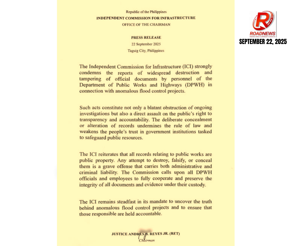 Pinapaalala ng ICI na ang lahat ng rekord na may kaugnayan sa public works ay ari-ng-publiko. Anumang pagtatangkang sirain, pekein, o itago ang mga ito ay isang malubhang pagkakasala na may kaakibat na administratibo at kriminal na pananagutan.