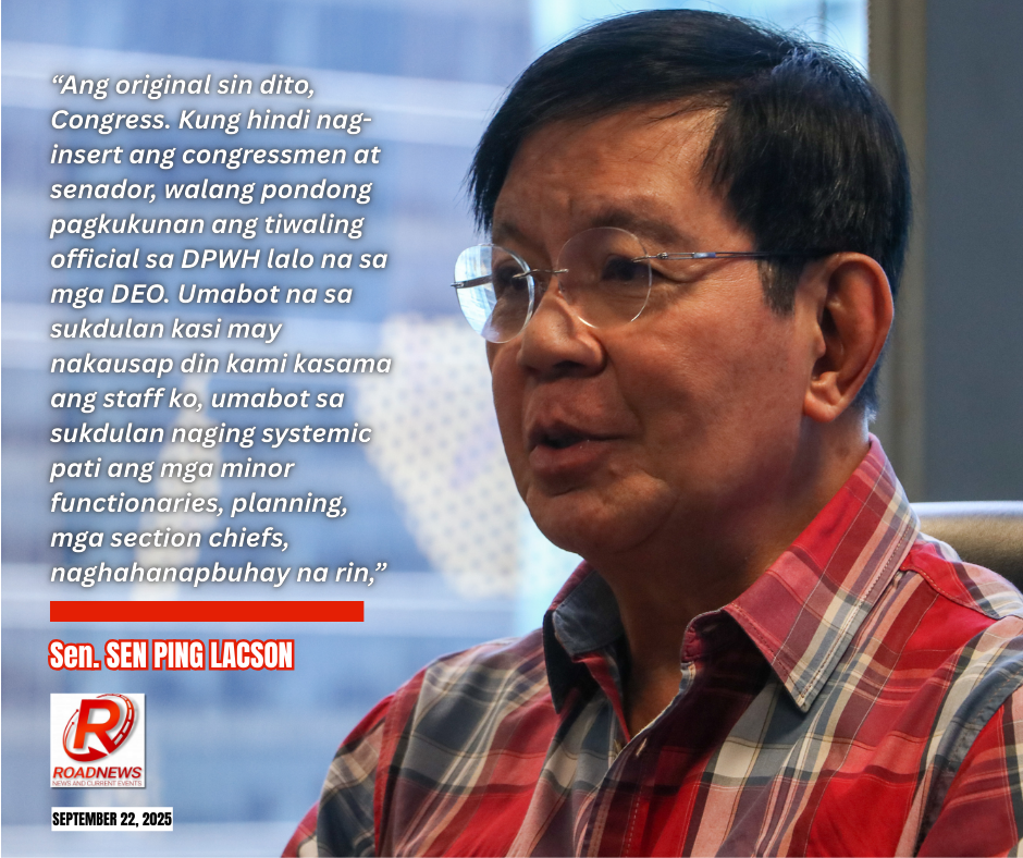 “Ang original sin dito, Congress. Kung hindi nag-insert ang congressmen at senador, walang pondong pagkukunan ang tiwaling official sa DPWH lalo na sa mga DEO. Umabot na sa sukdulan kasi may nakausap din kami kasama ang staff ko, umabot sa sukdulan naging systemic pati ang mga minor functionaries, planning, mga section chiefs, naghahanapbuhay na rin,” dagdag niya.