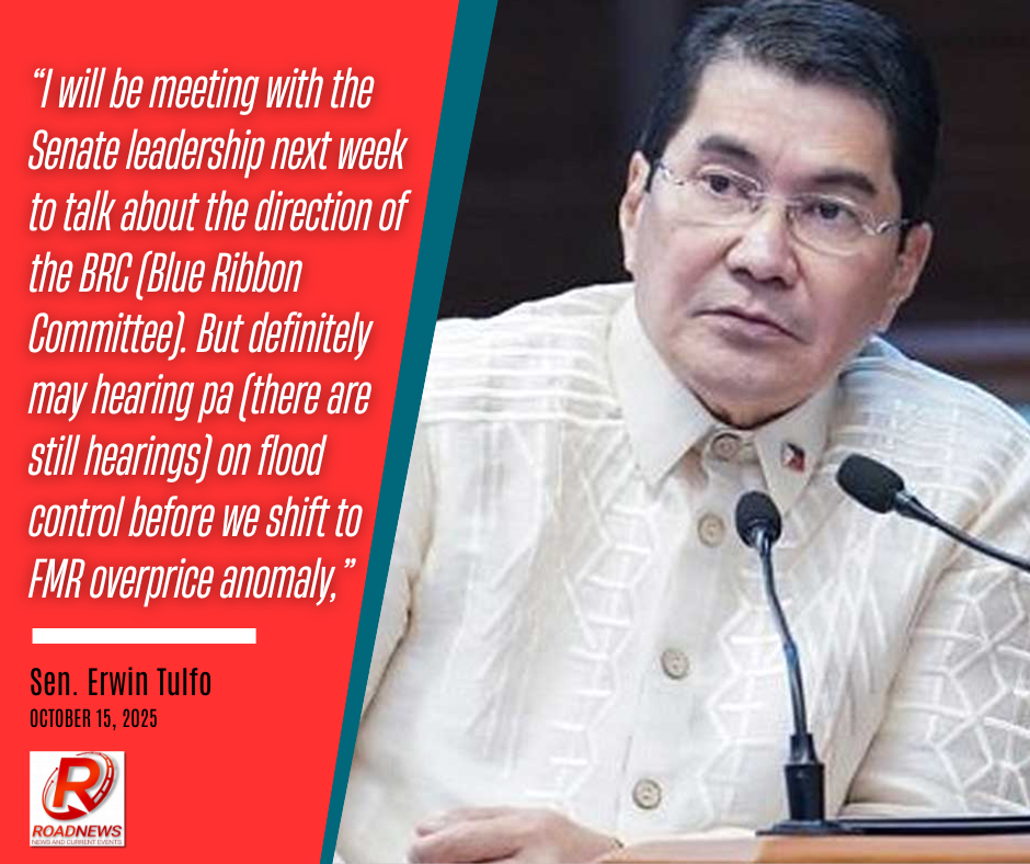 “I will be meeting with the Senate leadership next week to talk about the direction of the BRC (Blue Ribbon Committee). But definitely may hearing pa (there are still hearings) on flood control before we shift to FMR overprice anomaly,” ayon kay Tulfo.