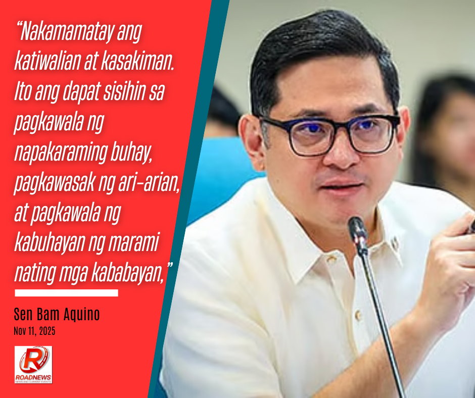 Mariing kinondena ni Senador Bam Aquino ang katiwalian at kasakiman na nasa likod ng daan-daang namatay at matinding pinsalang sanhi ng magkasunod na Bagyong Tino at Uwan sa iba’t ibang bahagi ng bansa.