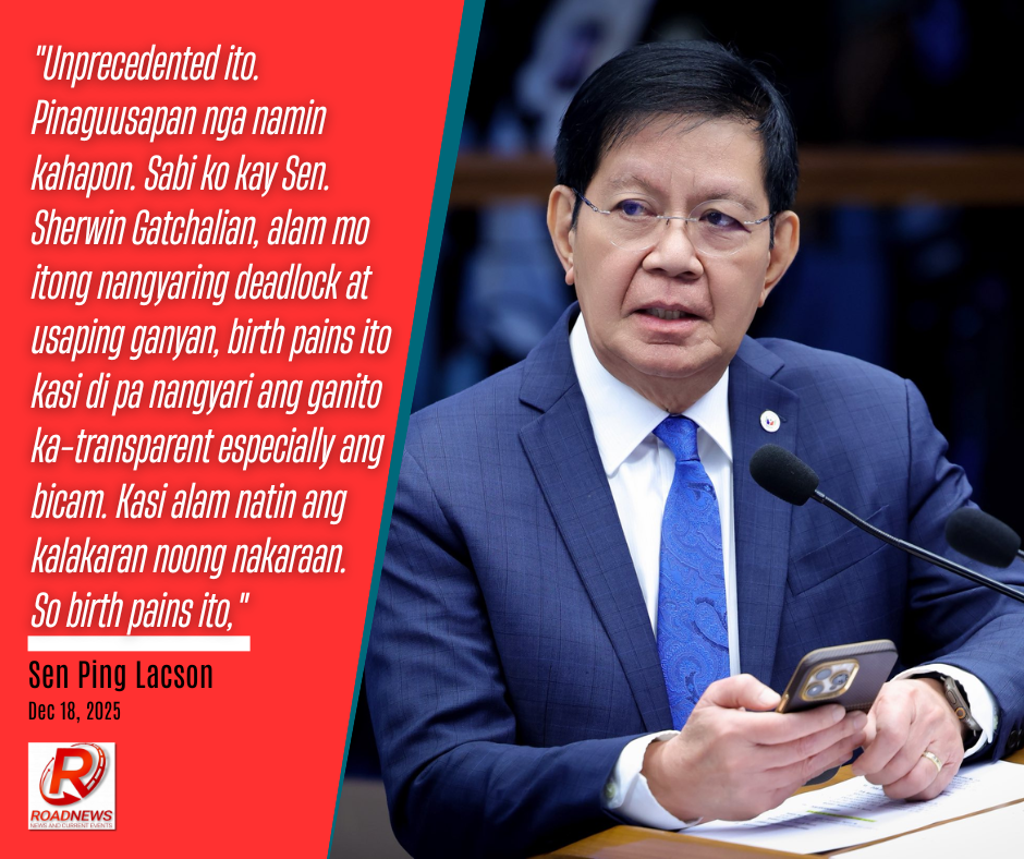 “Unprecedented ito. Pinaguusapan nga namin kahapon. Sabi ko kay Sen. Sherwin Gatchalian, alam mo itong nangyaring deadlock at usaping ganyan, birth pains ito kasi di pa nangyari ang ganito ka-transparent especially ang bicam. Kasi alam natin ang kalakaran noong nakaraan. So birth pains ito,” ani Lacson sa isang panayam sa isang himpilan ng radio.