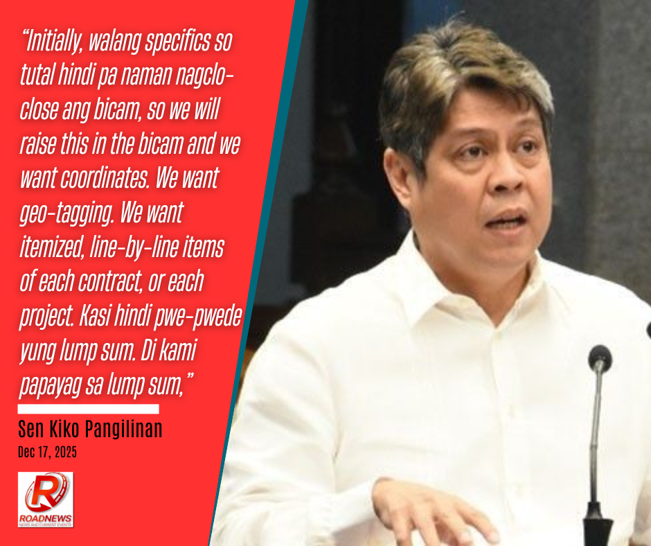 “Initially, walang specifics so tutal hindi pa naman nagclo-close ang bicam, so we will raise this in the bicam and we want coordinates. We want geo-tagging. We want itemized, line-by-line items of each contract, or each project. Kasi hindi pwe-pwede yung lump sum. Di kami papayag sa lump sum,” giit niya.
