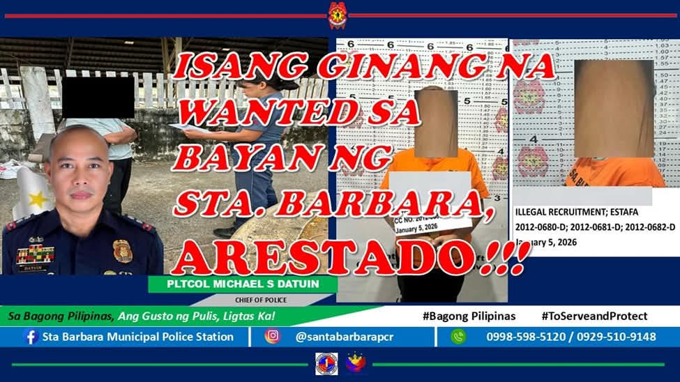Sa ilalim ng direktang pangangasiwa ni PLTCOL MICHAEL S DATUIN, Hepe ng Sta. Barbara MPS, bandang 8:20 ng umaga noong Enero 5, 2026, matagumpay na naaresto ng mga operatiba ng Sta. Barbara Municipal Police Station ang isang wanted na indibidwal sa Brgy. Poblacion Norte, Sta. Barbara, Pangasinan sa bisa ng mga warrant of arrest.
