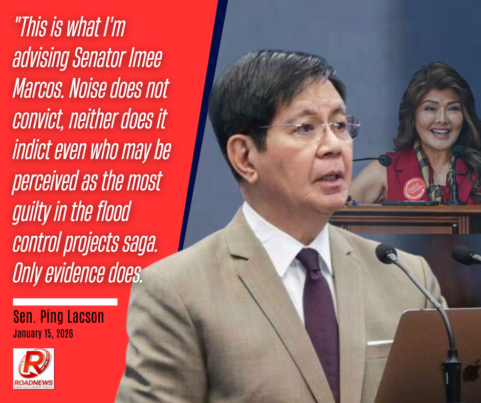 “This is what I’m advising Senator Imee Marcos. Noise does not convict, neither does it indict even who may be perceived as the most guilty in the flood control projects saga. Only evidence does. Kaya kung meron siyang maiaambag na ebidensiya para madiin ang kanyang pinsan, sumali siya sa pagdinig. Walang pipigil sa kanya at walang magbababawal sa sasabihin niya o gagawin niya,” ani Lacson sa Kapihan sa Senado media forum.