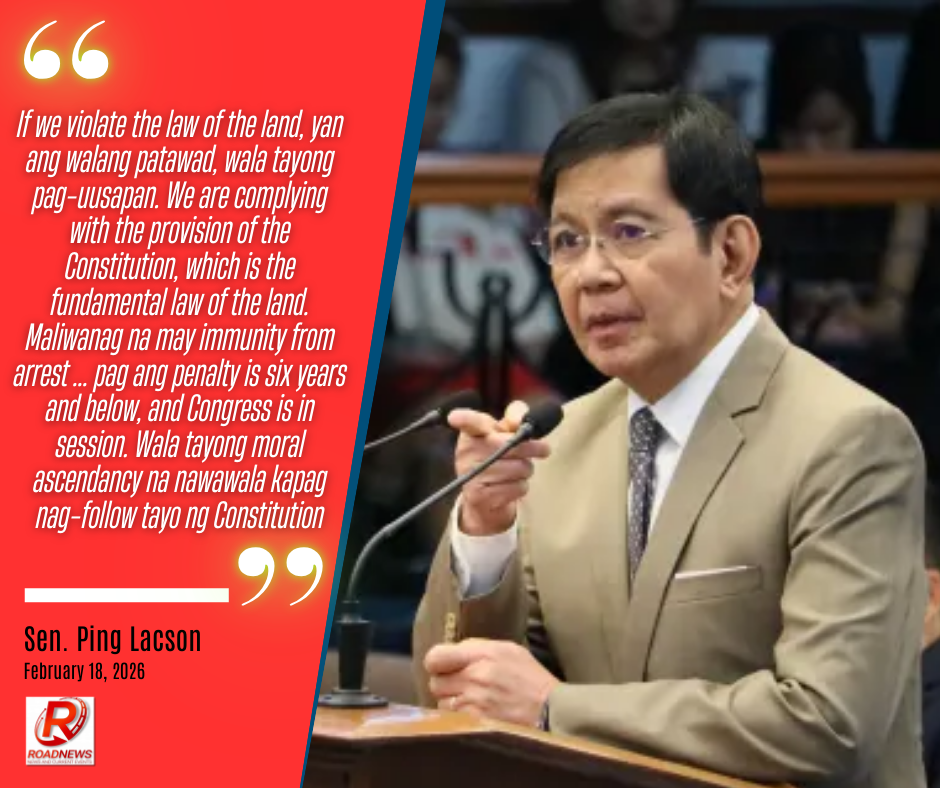“If we violate the law of the land, yan ang walang patawad, wala tayong pag-uusapan. We are complying with the provision of the Constitution, which is the fundamental law of the land. Maliwanag na may immunity from arrest … pag ang penalty is six years and below, and Congress is in session. Wala tayong moral ascendancy na nawawala kapag nag-follow tayo ng Constitution,” aniya sa isang panayam sa One News.