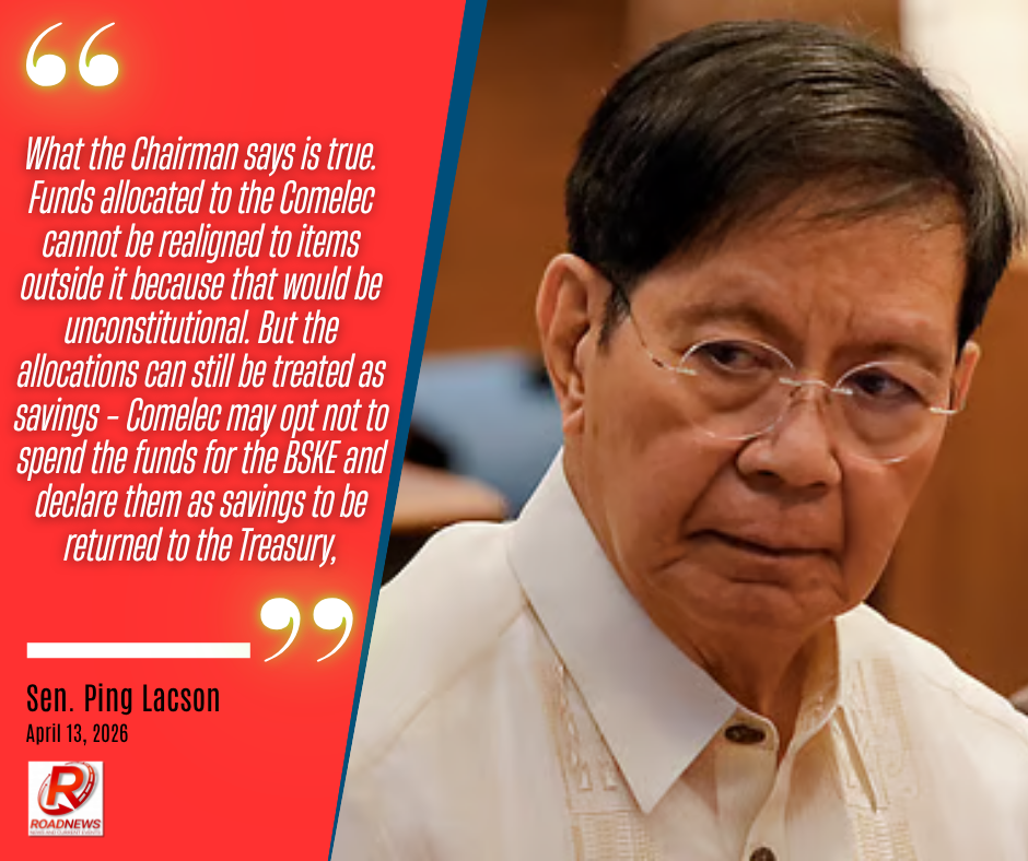 “What the Chairman says is true. Funds allocated to the Comelec cannot be realigned to items outside it because that would be unconstitutional. But the allocations can still be treated as savings – Comelec may opt not to spend the funds for the BSKE and declare them as savings to be returned to the Treasury,” aniya.