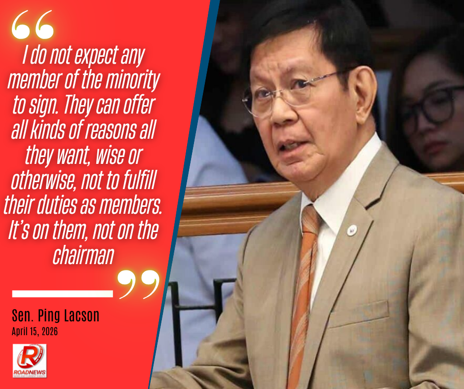 “I do not expect any member of the minority to sign. They can offer all kinds of reasons all they want, wise or otherwise, not to fulfill their duties as members. It’s on them, not on the chairman,” ani Lacson.